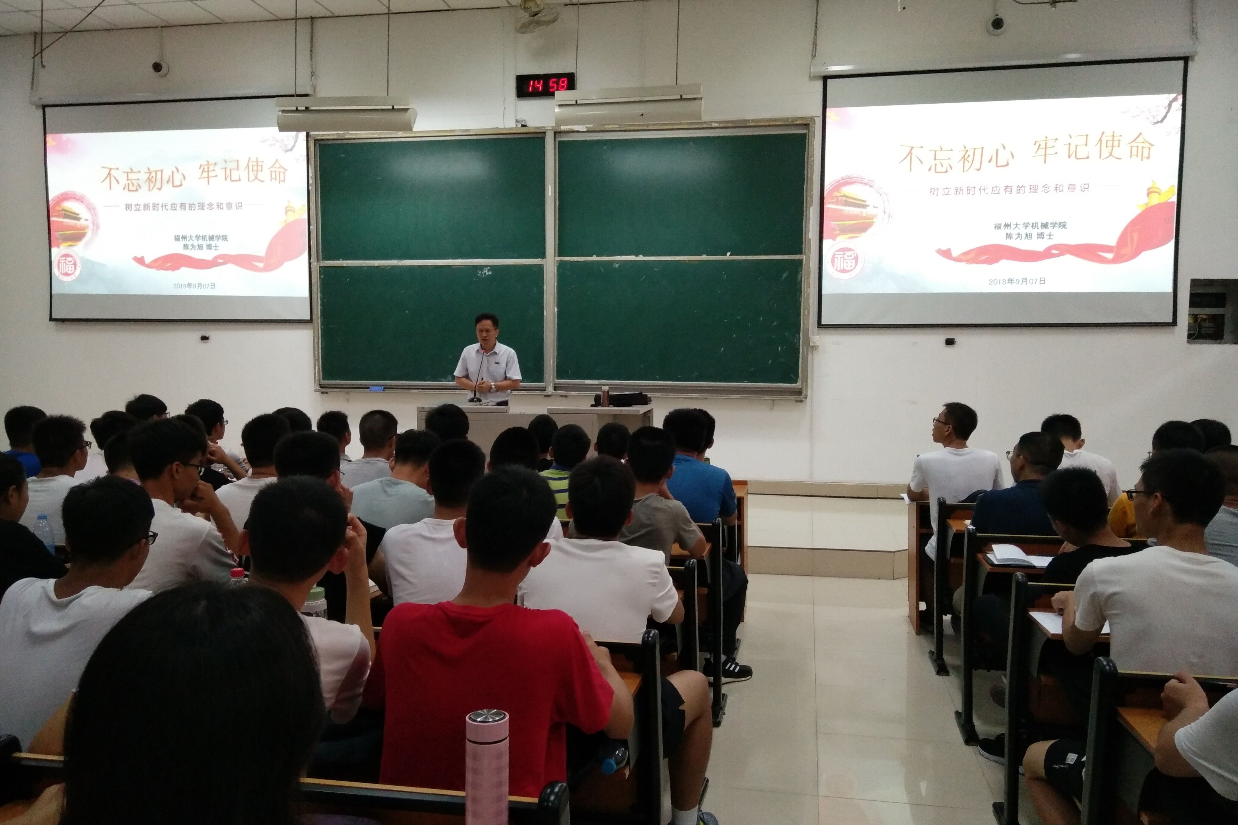 9月7日,opta官网于文三-101举办主题为“不忘初心,牢记使命”的新生教育讲座。会议由党委书记陈为旭研究员主讲,opta官网全体2018级本科生参加了本次讲座。