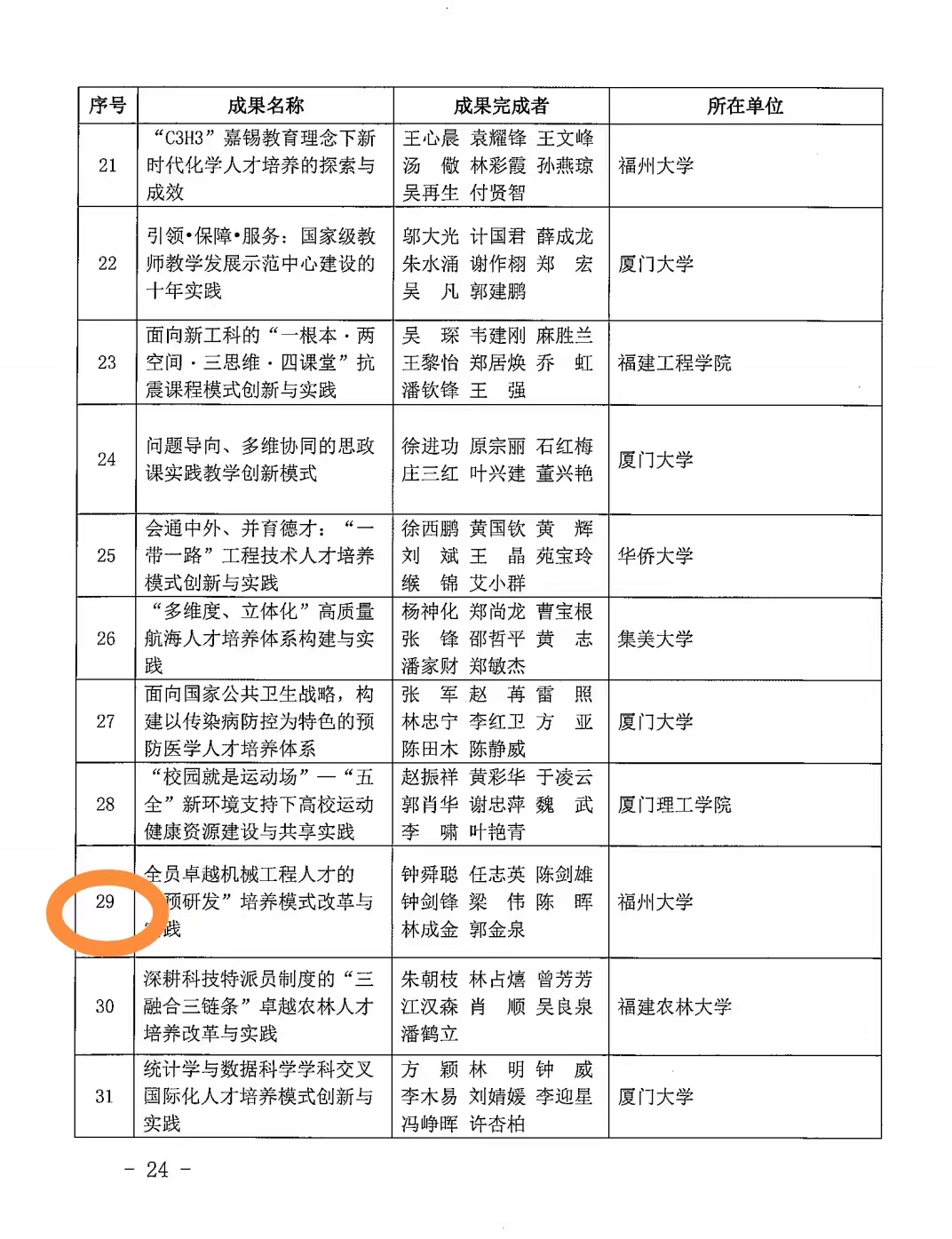 近日,福建省教育厅发布《福建省教育厅关于公布2022年省级教学成果奖获奖成果的通知》(闽教师 [2022] 60号),钟舜聪院长主持的“全员卓越机械工程人才的‘预研发’培养模式改革与实践”喜获2022年福建省高等教育教学成果特等奖。