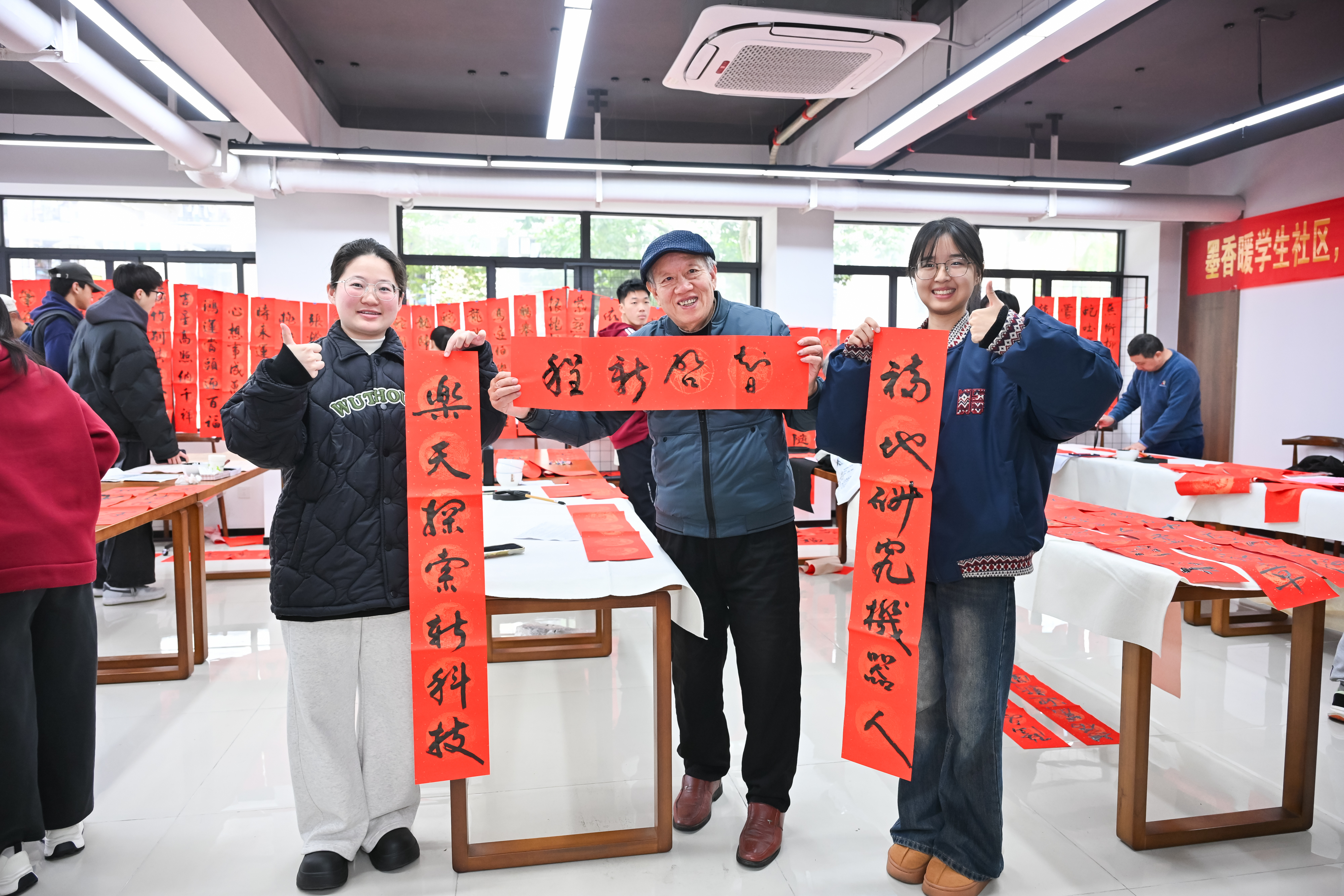 同学们围在书法家身旁,领略流畅洒脱的笔法之美,聆听春联背后丰富的文化故事。大家在老艺术家们的指导下纷纷动手书写春联,亲身体验中华传统书法的独特魅力。现场气氛热烈又温馨,欢声笑语不绝于耳。