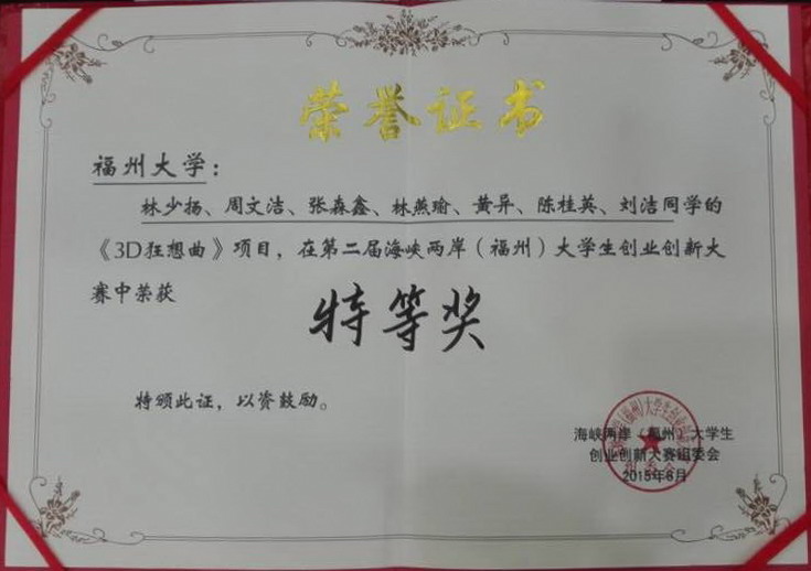 8月9日第二届海峡两岸(福州)大学生创业创新大赛在海峡会展中心落下帷幕,由机械工程及自动化学院林少扬、张森鑫、黄异等“小平科技创新团队”主要成员为首的创业团队,在林文麟、夏钢、林成金等组成的指导老师团队的指导下,凭借《3D狂想曲》项目在50个入围决赛的项目中突出重围,获得特等奖。除获得奖金奖励外,还享有大赛配套的10条创业扶持政策。本届大赛自2014年12月18日启动以来,共吸引了海峡两岸198所高校的740个大学生创业创新项目团队报名。经过初赛激烈角逐,共有来自大陆地区浙江大学、厦门大学、北京师范大学、中南大学、opta足球数据官网等和台湾地区台湾成功大学、台湾交通大学等50个项目入围决赛。