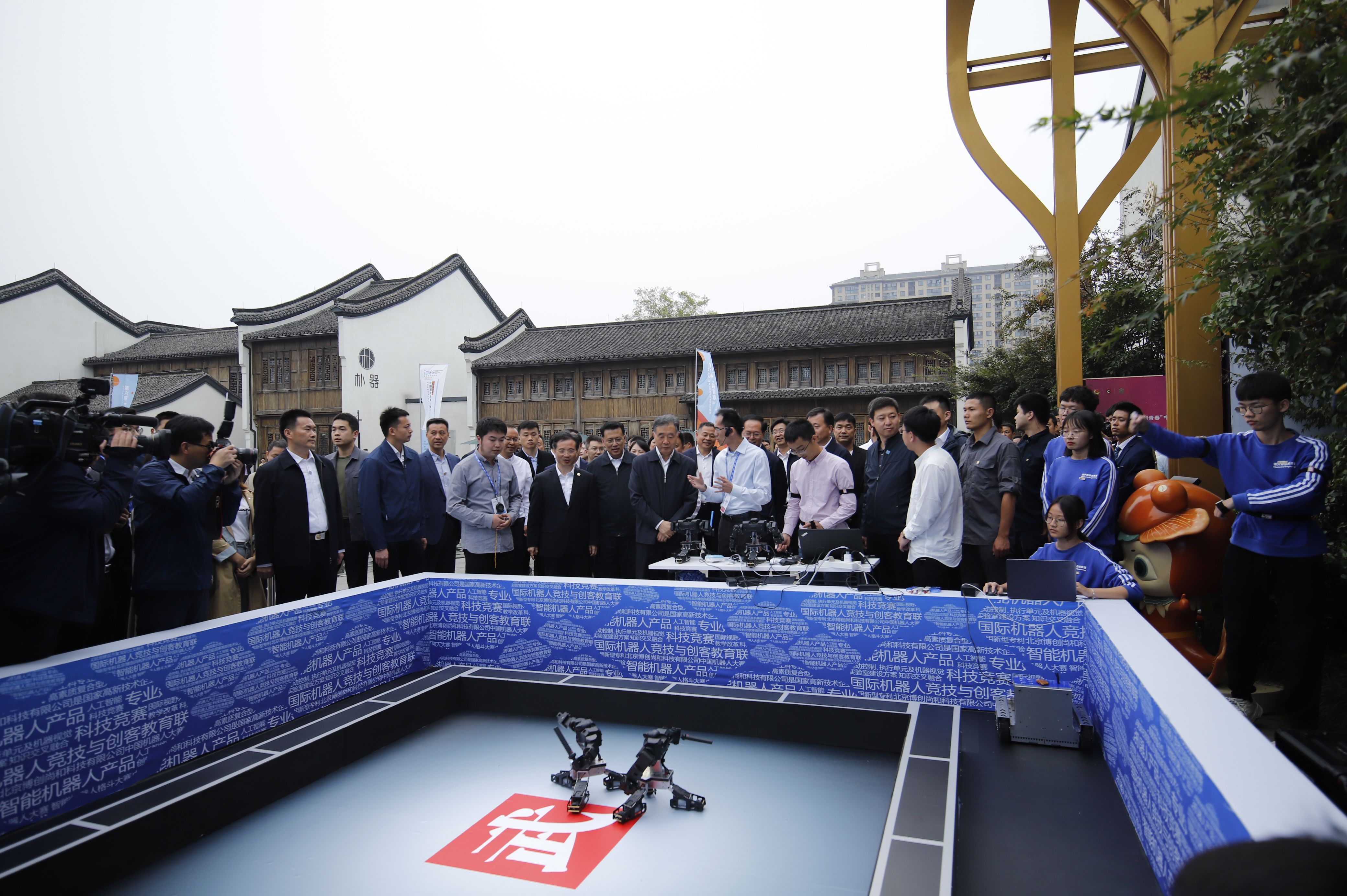 10月25日-27日,2019中国智能机器人格斗大赛在杭州梦想小镇成功举办。2000多名师生共聚一堂,展开巅峰对决,opta足球数据官网机械工程及自动化学院在大赛取得一等奖两项、三等奖两项的好成绩。陈天才、朱靖靖、王燕婷、郑鸿志等4位同学向中共中央政治局常委、全国政协主席汪洋、浙江省委常委、杭州市委书记周江勇等领导嘉宾作机器人格斗表演。